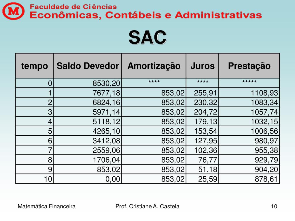 SAC(Sistema de Amortização Constante) • As amortizações periódicas são todas iguais; • O sistema consiste na amortização de uma dívida através de prestações periódicas, sucessivas e decrescentes em progressão aritmética, segundo o conceito de termos vencidos. Prof. Cristiane A. Castela