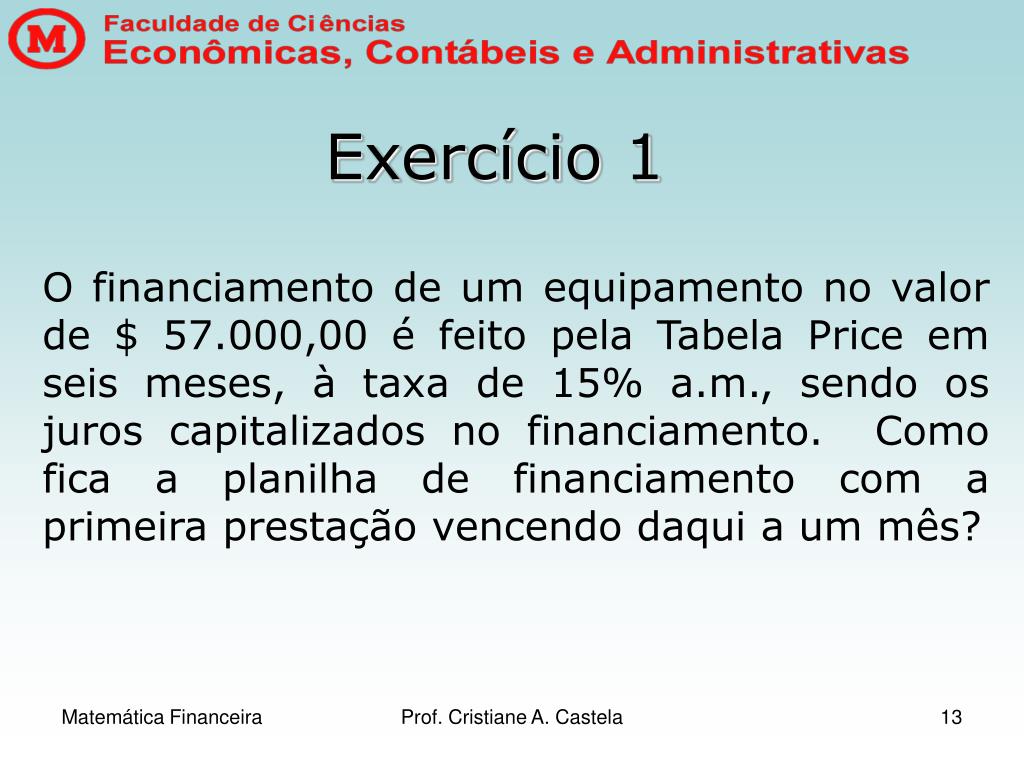 Exercício 1 O financiamento de um equipamento no valor de $ 57.000,00 é feito pela Tabela Price em seis meses, à taxa de 15% a.m., sendo os juros capitalizados no financiamento. Como fica a planilha de financiamento com a primeira prestação vencendo daqui a um mês? Prof. Cristiane A. Castela