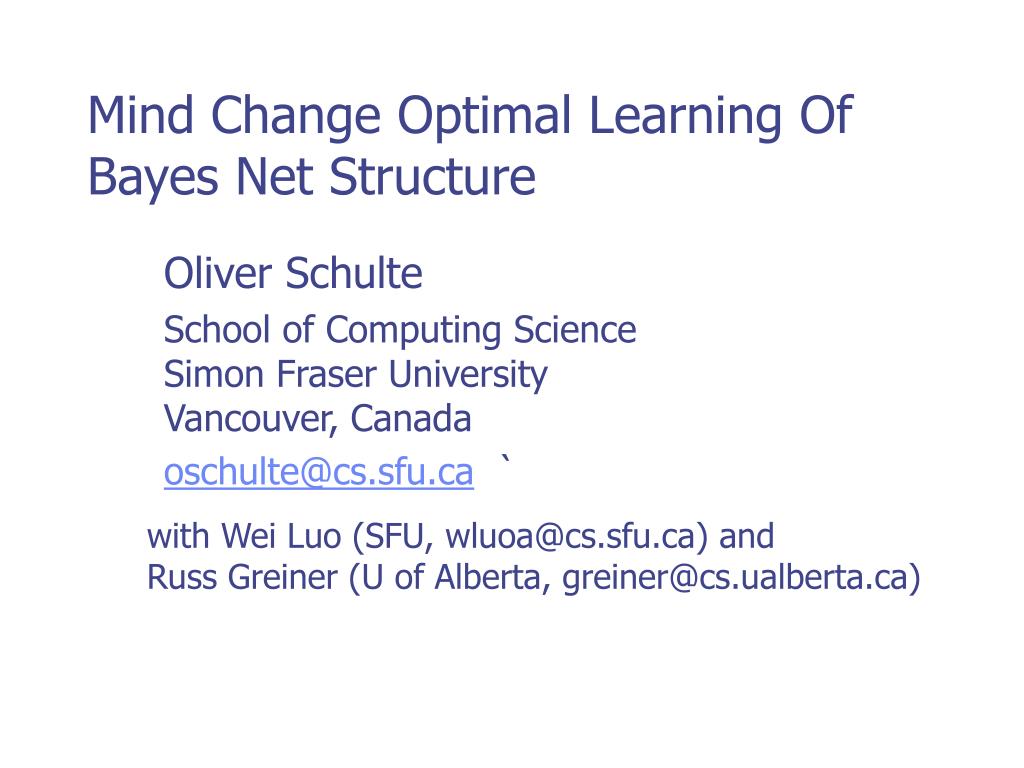 Mind Change Optimal Learning Of Bayes Net Structure Oliver Schulte School of Computing ScienceSimon Fraser UniversityVancouver, Canada oschulte@cs.sfu.ca ` with Wei Luo (SFU, wluoa@cs.sfu.ca) andRuss Greiner (U of Alberta, greiner@cs.ualberta.ca)