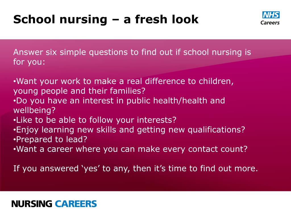 School nursing – a fresh look • Answer six simple questions to find out if school nursing is for you: • Want your work to make a real difference to children, young people and their families? • Do you have an interest in public health/health and wellbeing? • Like to be able to follow your interests? • Enjoy learning new skills and getting new qualifications? • Prepared to lead? • Want a career where you can make every contact count? • If you answered ‘yes’ to any, then it’s time to find out more.