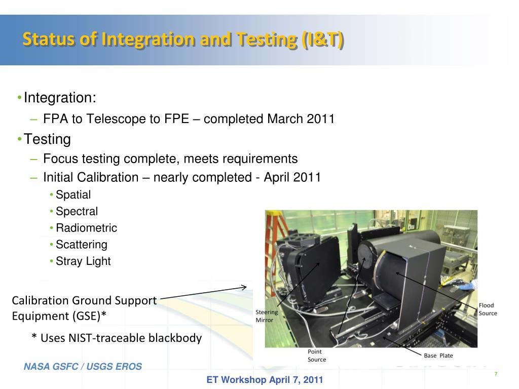 Status of Integration and Testing (I&T) • Integration: • FPA to Telescope to FPE – completed March 2011 • Testing • Focus testing complete, meets requirements • Initial Calibration – nearly completed - April 2011 • Spatial • Spectral • Radiometric • Scattering • Stray Light Calibration Ground Support Equipment (GSE)* * Uses NIST-traceable blackbody