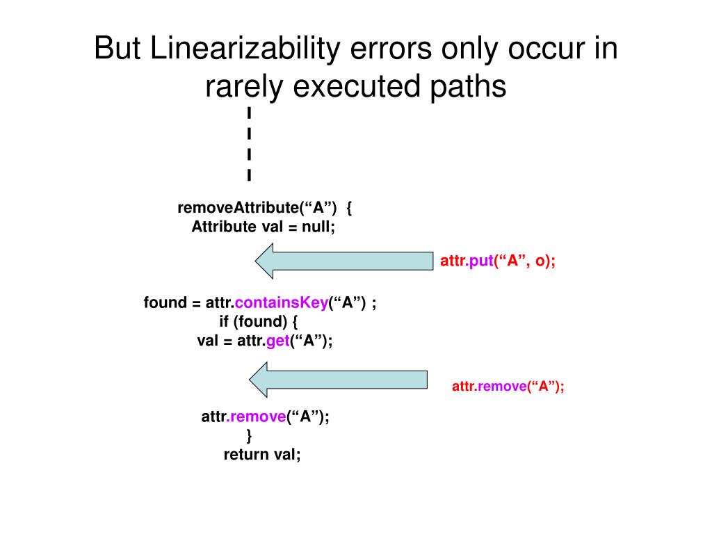 But Linearizability errors only occur in rarely executed paths attr.put(“A”, o); removeAttribute(“A”) { Attribute val = null; found = attr.containsKey(“A”) ; if (found) { val = attr.get(“A”); attr.remove(“A”); } return val; attr.remove(“A”);