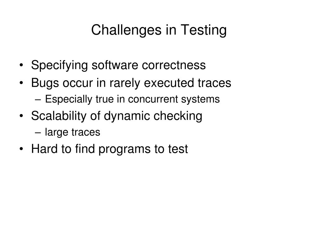 Challenges in Testing • Specifying software correctness • Bugs occur in rarely executed traces • Especially true in concurrent systems • Scalability of dynamic checking • large traces • Hard to find programs to test