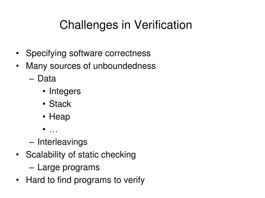 Challenges in Verification • Specifying software correctness • Many sources of unboundedness • Data • Integers • Stack • Heap • … • Interleavings • Scalability of static checking • Large programs • Hard to find programs to verify