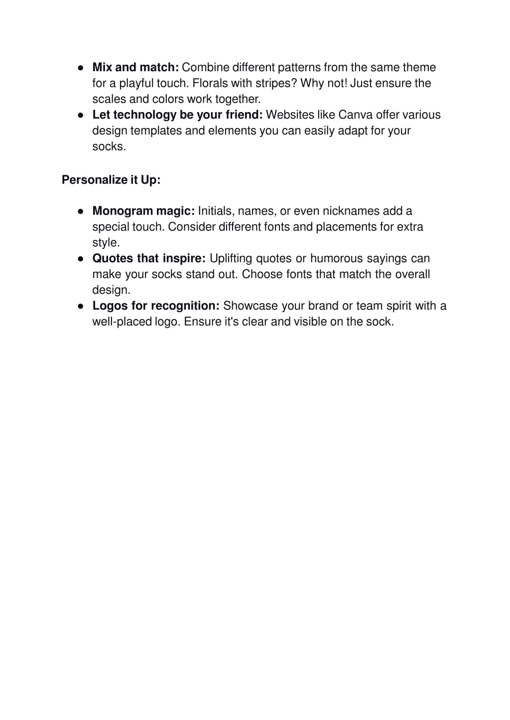 Mix and match: Combine different patterns from the same theme for a playful touch. Florals with stripes? Why not! Just ensure the scalesand colors work together. • Let technology be your friend: Websites like Canva offer various design templates and elements you can easily adapt for your socks. • PersonalizeitUp: • Monogram magic: Initials, names, or even nicknames add a special touch. Consider different fonts and placements for extra style. • Quotes that inspire: Uplifting quotes or humorous sayings can make your socks stand out. Choose fonts that match the overall design. • Logos for recognition: Showcase your brand or team spirit with a well-placedlogo. Ensureit's clearand visible onthe sock.