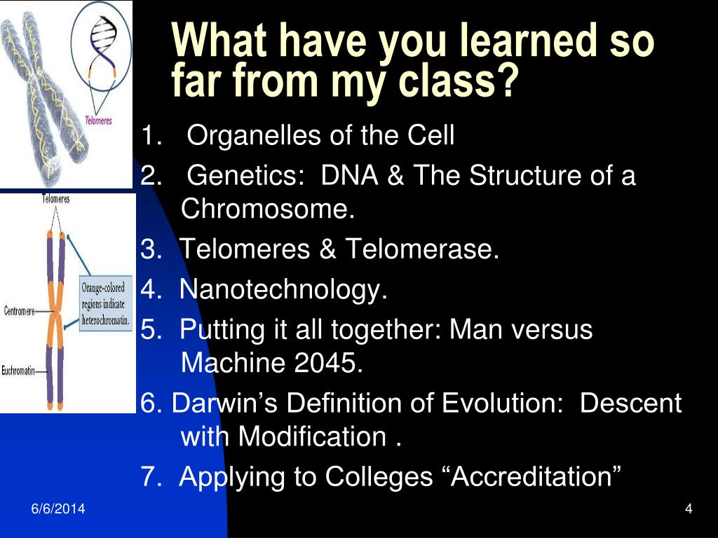 What have you learned so far from my class? 1. Organelles of the Cell 2. Genetics: DNA & The Structure of a Chromosome. 3. Telomeres & Telomerase. 4. Nanotechnology. 5. Putting it all together: Man versus Machine 2045. 6. Darwin’s Definition of Evolution: Descent with Modification . 7. Applying to Colleges “Accreditation”