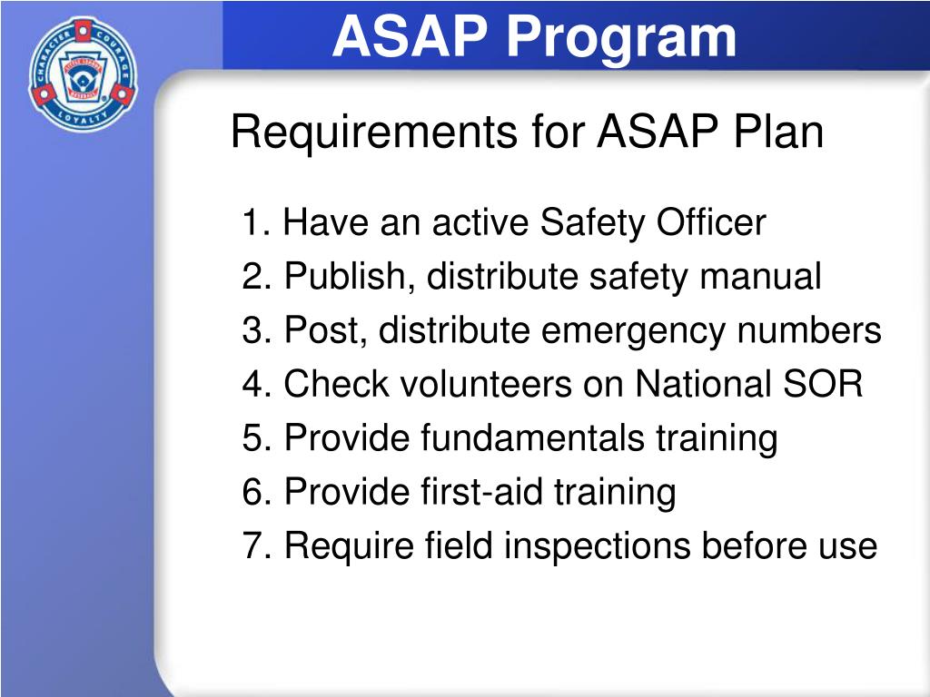 Requirements for ASAP Plan ASAP Program 1. Have an active Safety Officer 2. Publish, distribute safety manual 3. Post, distribute emergency numbers 4. Check volunteers on National SOR 5. Provide fundamentals training 6. Provide first-aid training 7. Require field inspections before use