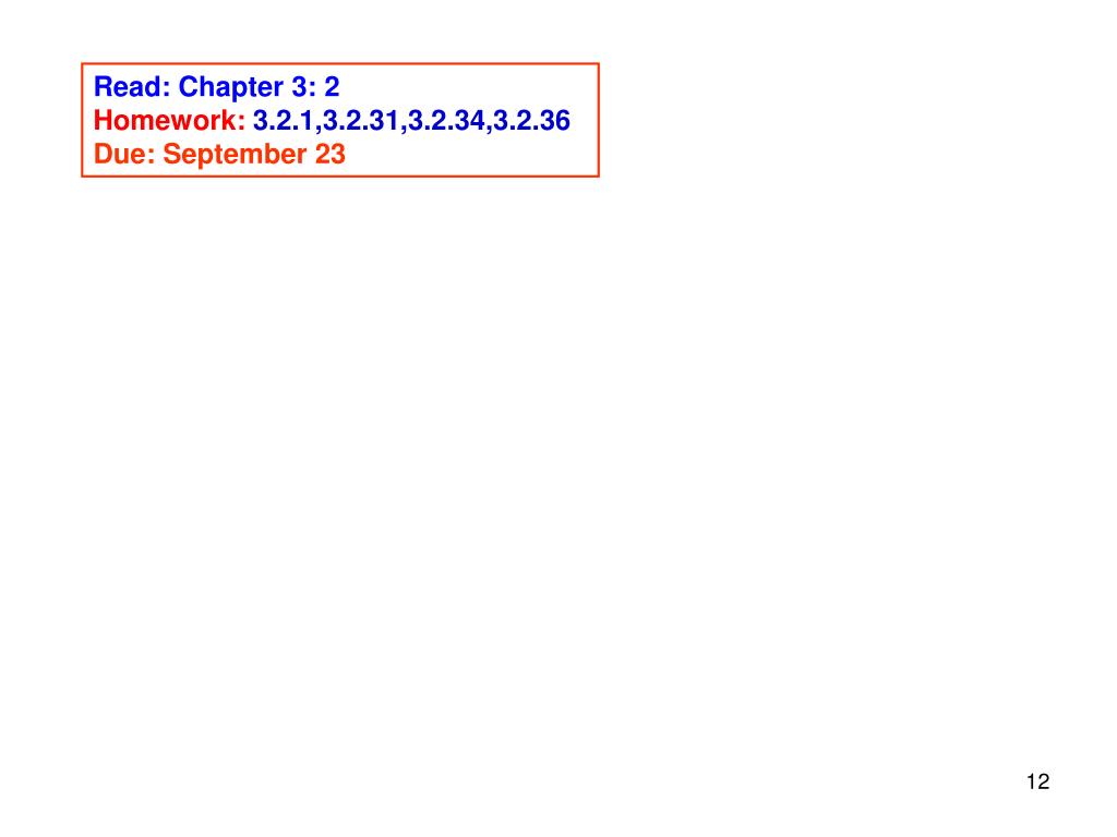 Read: Chapter 3: 2 Homework: 3.2.1,3.2.31,3.2.34,3.2.36 Due: September 23