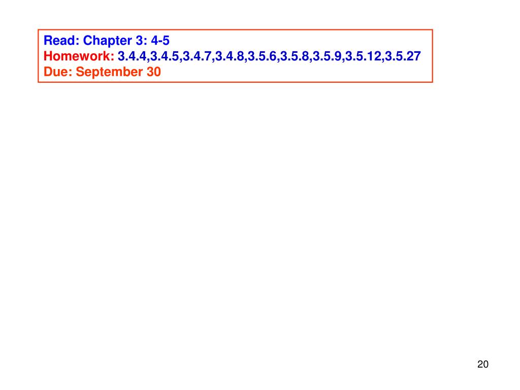 Read: Chapter 3: 4-5 Homework: 3.4.4,3.4.5,3.4.7,3.4.8,3.5.6,3.5.8,3.5.9,3.5.12,3.5.27 Due: September 30