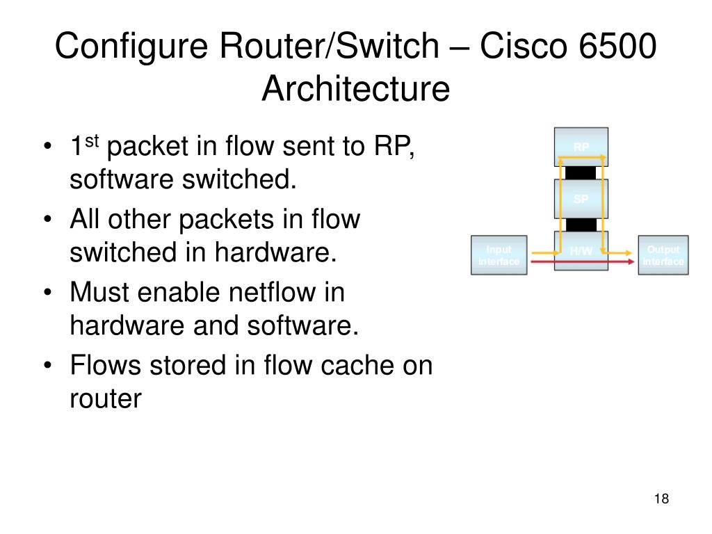 Configure Router/Switch – Cisco 6500Architecture • 1st packet in flow sent to RP, software switched. • All other packets in flow switched in hardware. • Must enable netflow in hardware and software. • Flows stored in flow cache on router
