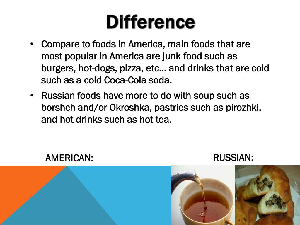 Difference • Compare to foods in America, main foods that are most popular in America are junk food such as burgers, hot-dogs, pizza, etc… and drinks that are cold such as a cold Coca-Cola soda. • Russian foods have more to do with soup such as borshch and/or Okroshka, pastries such as pirozhki, and hot drinks such as hot tea. RUSSIAN: AMERICAN: