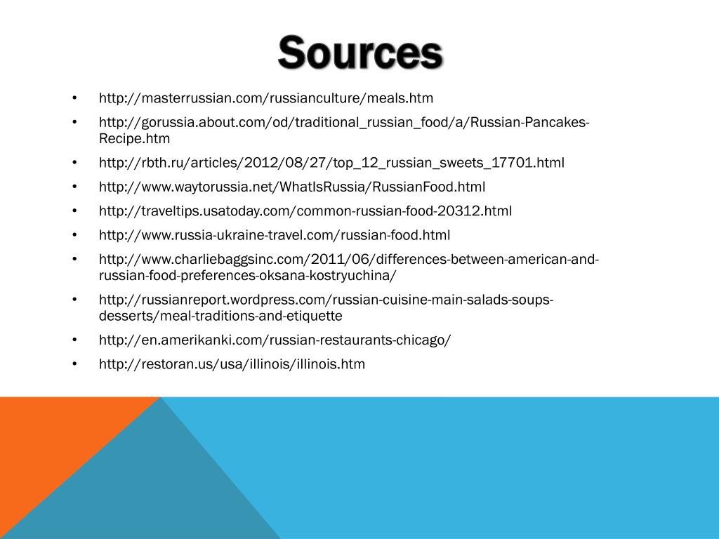 Sources • http://masterrussian.com/russianculture/meals.htm • http://gorussia.about.com/od/traditional_russian_food/a/Russian-Pancakes-Recipe.htm • http://rbth.ru/articles/2012/08/27/top_12_russian_sweets_17701.html • http://www.waytorussia.net/WhatIsRussia/RussianFood.html • http://traveltips.usatoday.com/common-russian-food-20312.html • http://www.russia-ukraine-travel.com/russian-food.html • http://www.charliebaggsinc.com/2011/06/differences-between-american-and-russian-food-preferences-oksana-kostryuchina/ • http://russianreport.wordpress.com/russian-cuisine-main-salads-soups-desserts/meal-traditions-and-etiquette • http://en.amerikanki.com/russian-restaurants-chicago/ • http://restoran.us/usa/illinois/illinois.htm