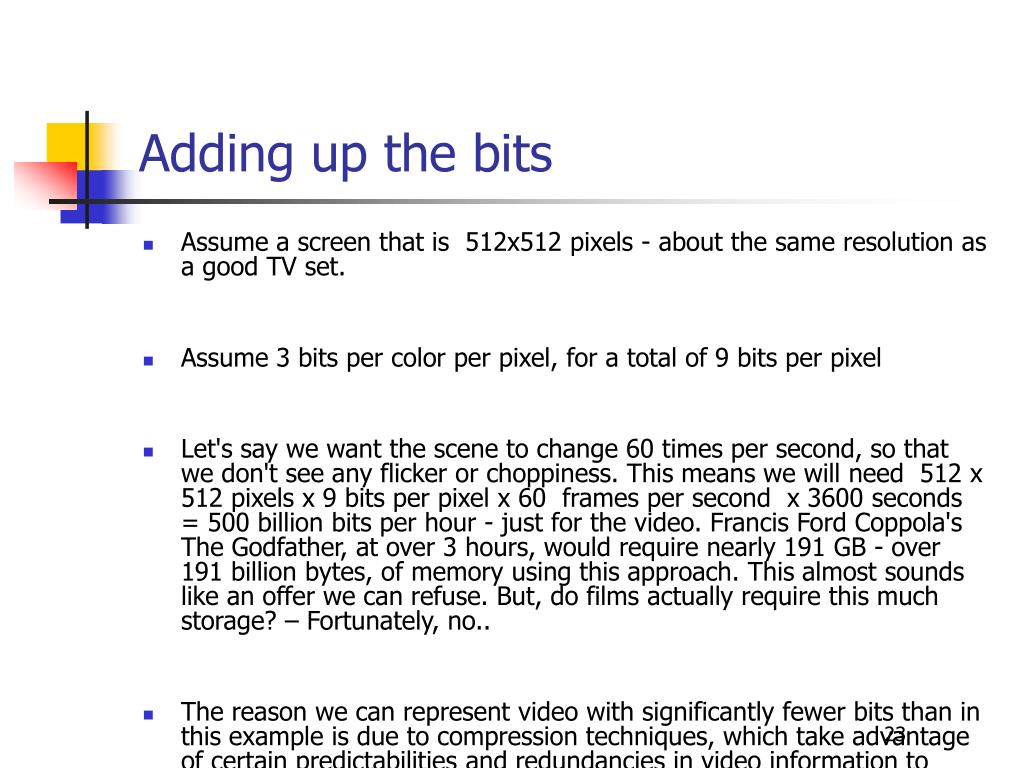 Adding up the bits • Assume a screen that is 512x512 pixels - about the same resolution as a good TV set. • Assume 3 bits per color per pixel, for a total of 9 bits per pixel • Let's say we want the scene to change 60 times per second, so that we don't see any flicker or choppiness. This means we will need 512 x 512 pixels x 9 bits per pixel x 60 frames per second x 3600 seconds = 500 billion bits per hour - just for the video. Francis Ford Coppola's The Godfather, at over 3 hours, would require nearly 191 GB - over 191 billion bytes, of memory using this approach. This almost sounds like an offer we can refuse. But, do films actually require this much storage? – Fortunately, no.. • The reason we can represent video with significantly fewer bits than in this example is due to compression techniques, which take advantage of certain predictabilities and redundancies in video information to reduce the amount of information to be stored.