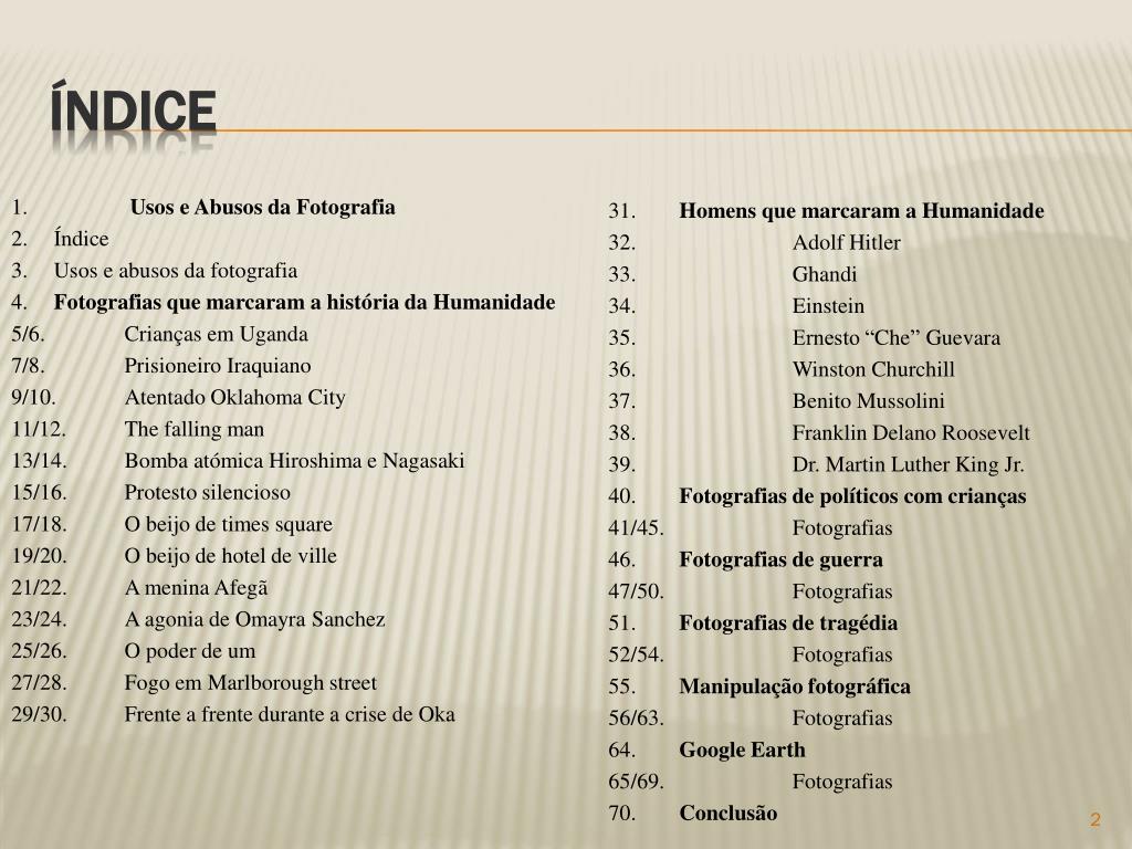 1. Usos e Abusos da Fotografia 2. Índice 3. Usos e abusos da fotografia 4. Fotografias que marcaram a história da Humanidade 5/6. Crianças em Uganda 7/8. Prisioneiro Iraquiano 9/10. Atentado Oklahoma City 11/12. Thefallingman 13/14. Bomba atómica Hiroshima e Nagasaki 15/16. Protesto silencioso 17/18. O beijo de timessquare 19/20. O beijo de hotel de ville 21/22. A menina Afegã 23/24. A agonia de OmayraSanchez 25/26. O poder de um 27/28. Fogo em Marlboroughstreet 29/30. Frente a frente durante a crise de Oka 31. Homens que marcaram a Humanidade 32. Adolf Hitler 33. Ghandi 34. Einstein 35. Ernesto “Che” Guevara 36. Winston Churchill 37. Benito Mussolini 38. Franklin DelanoRoosevelt 39.Dr. Martin Luther King Jr. 40.Fotografias de políticos com crianças 41/45. Fotografias 46.Fotografias de guerra 47/50. Fotografias 51.Fotografias de tragédia 52/54. Fotografias 55.Manipulação fotográfica 56/63. Fotografias 64.Google Earth 65/69. Fotografias 70.Conclusão índice