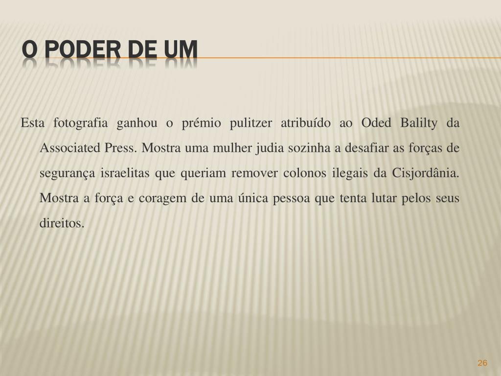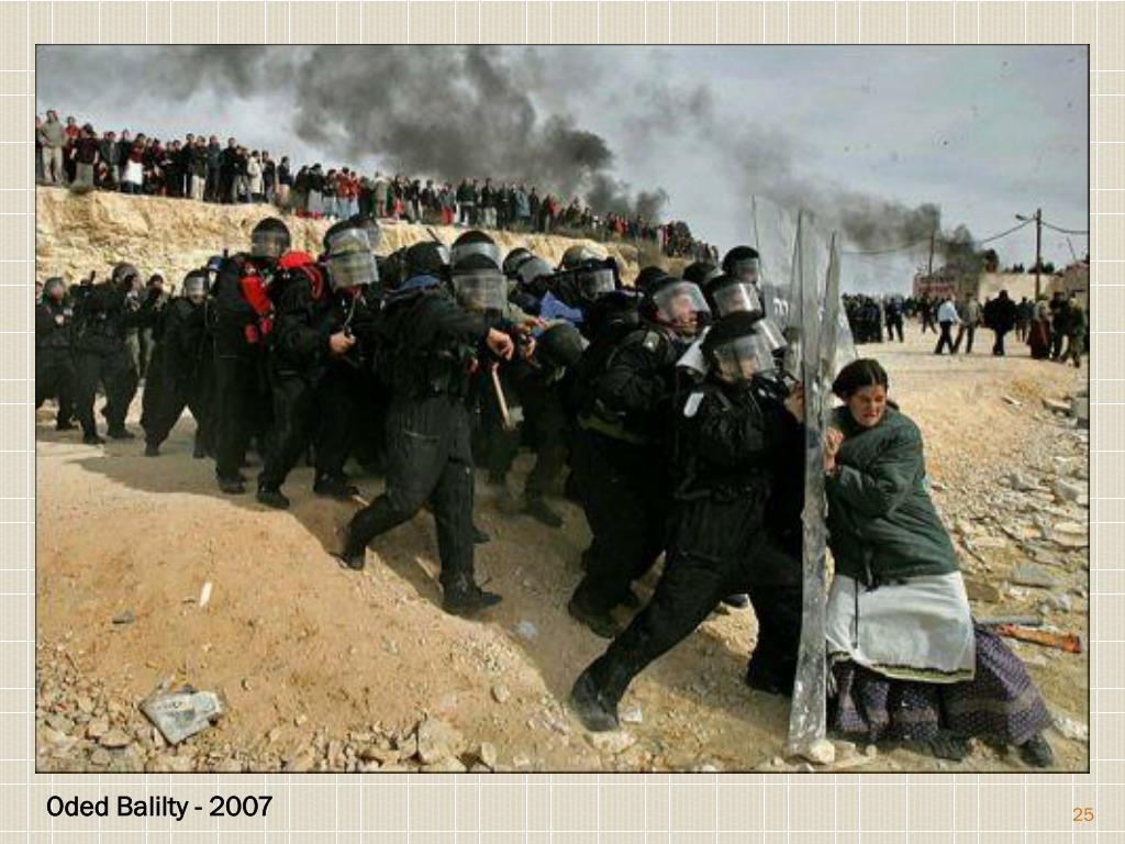 Esta fotografia ganhou o prémio pulitzer atribuído ao Oded Balilty da AssociatedPress. Mostra uma mulher judia sozinha a desafiar as forças de segurança israelitas que queriam remover colonos ilegais da Cisjordânia. Mostra a força e coragem de uma única pessoa que tenta lutar pelos seus direitos. O poder de um