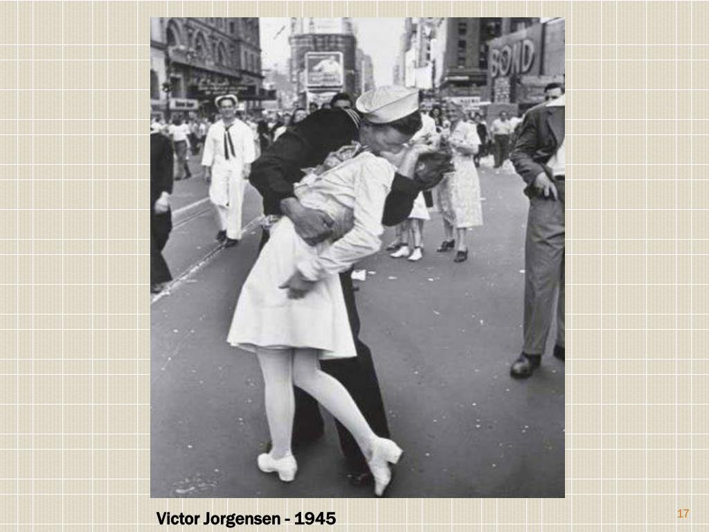 O Beijo de despedida da Guerra foi feita por Victor Jorgensen na TimesSquare em 14 de Agosto de 1945, onde um soldado da marinha norte-americana beija apaixonadamente uma enfermeira. O que é fora do comum para aquela época é que os dois personagens não eram um casal, eram perfeitos estranhos que haviam acabado de encontrar-se.A fotografia, grande ícone, é considerada uma analogia da excitação e paixão que significa regressar a casa depois de passar uma longa temporada fora, como também a alegria experimentada ao término de uma guerra. O beijo da timessquare