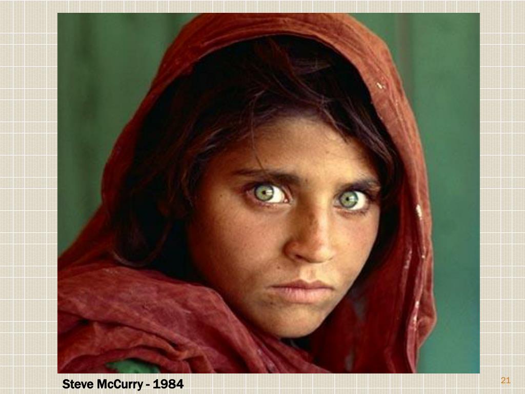 Sharbat Gula foi fotografada quando tinha 12 anos pelo fotógrafo SteveMcCurry, em Junho de 1984. Foi no acampamento de refugiados NasirBagh do Paquistão durante a guerra contra a invasão soviética.A sua foto foi publicada na capa da National Geographic em Junho de 1985 e, devido a seu expressivo rosto de olhos verdes, a capa converteu-se numa das mais famosas da revista e do mundo.No entanto, naquele tempo ninguém sabia o nome dela. O mesmo homem que a fotografou realizou uma busca à jovem que durou 17 anos. Em Janeiro de 2002, encontrou a menina, já uma mulher de 30 anos e pôde saber seu nome. Sharbat Gula vive numa aldeia remota do Afeganistão, é uma mulher tradicional pastún, casada e mãe de três filhos. Ela regressou ao Afeganistão em 1992. A menina afegã