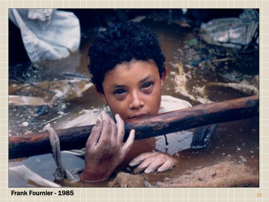Omayra Sanchez foi uma menina vítima do vulcão Nevado delRuiz durante a erupção que arrasou o povoado de Armero, Colômbia em 1985.Omayra ficou três dias no lodo, água e restos da sua própria casa e presa aos corpos dos próprios pais. Quando os paramédicos de tentaram ajudá-la, comprovaram que era impossível, já que para tirá-la precisavam amputar-lhe as pernas, e a falta de um especialista para tal cirurgia resultaria na morte da menina. Omayra mostrou-se forte até ao último momento de sua vida, segundo os paramédicos e jornalistas que a rodeavam.Durante os três dias, manteve-se pensando somente em voltar ao colégio nos seus exames e a convivência com seus amigos.O fotógrafo Frank Fournier fez uma foto de Omayra que deu a volta ao mundo e originou uma certa controvérsia a respeito da indiferença do Governo Colombiano. A fotografia foi publicada meses após o falecimento de Omayra. Muitos vêem nesta imagem de 1985 o começo do que hoje chamamos Globalização, pois a sua agonia foi vivenciada em tempo real pelas câmaras de televisão de todo o mundo. A agonia de omayrasanchez