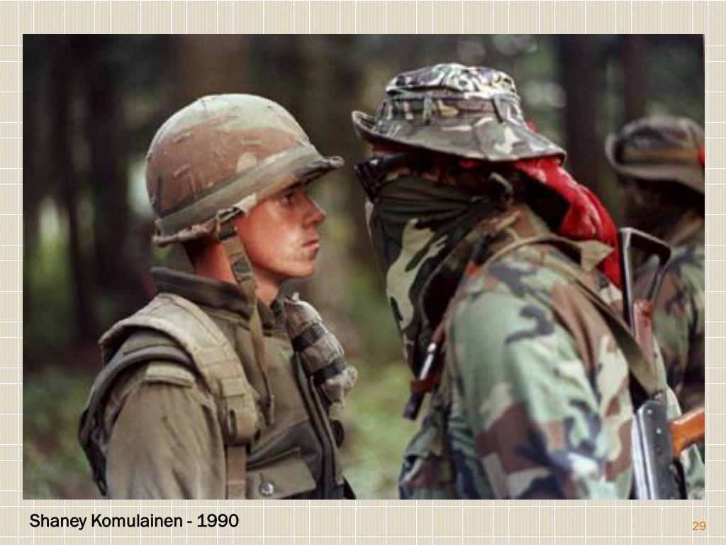 Esta é provavelmente a fotografia mais famosa do Canadá. A crise Oka foi uma disputa de terra entre a nação Mohawk e da cidade de Oka, Quebec, que começou a 11 de Março de 1990, e durou até 26 de Setembro de 1990. Resultou em três mortes, e seria o primeiro de uma série de conflitos violentos entre os povos indígenas e o governo canadiano no final do século XX. Frente a frente durante a crise de oka