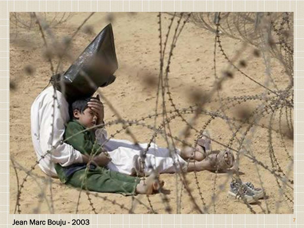 Prisioneiro iraquiano da guerra tentando acalmar o seu filho. O que esta imagem nos mostra hoje é a força extraordinariamente poderosa do Amor. O gesto de amor e protecção deste pai de cara coberta por um “capuz” de guerra, desfaz a insensatez e a loucura assassina da guerra e da violência, pois coloca o nosso próprio rosto dentro daquele capuz. Prisioneiro Iraquiano