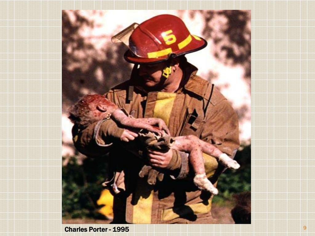 Às 9 horas da manhã do dia 19 de Abril de 1995 em Oklahoma City, foi estacionado um caminhão Ryder com cerca de 2300 quilos de explosivos em frente ao edifício federal Alfred P. Murrah. A bomba caseira era feito de uma mistura caseira conhecida como ANFO (nitrato de amónia misturada com nitro metano). A explosão foi tão poderosa que destruiu completamente a fachada e destruiu boa parte do edifício, além do mais, os seus efeitos foram sentidos a 48 quilómetros de distância. No total, 168 oito pessoas morreram na explosão, que deixou também mais de 800 feridos. O bombeiro ChrisFields retirando o pequeno BayleeAlmon dos escombros do prédio Alfred. P. Murrah. A foto, tirada pelo fotógrafo amador Charles Porter, na época com 25 anos, foi vencedora do prêmioPulitzer no ano de 1996. Atentado de Oklahoma City