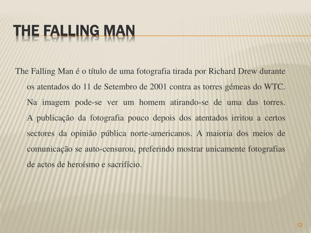 The FallingMan é o título de uma fotografia tirada por RichardDrew durante os atentados do 11 de Setembro de 2001 contra as torres gémeas do WTC. Na imagem pode-se ver um homem atirando-se de uma das torres.A publicação da fotografia pouco depois dos atentados irritou a certos sectores da opinião pública norte-americanos. A maioria dos meios de comunicação se auto-censurou, preferindo mostrar unicamente fotografias de actos de heroísmo e sacrifício. The falling man