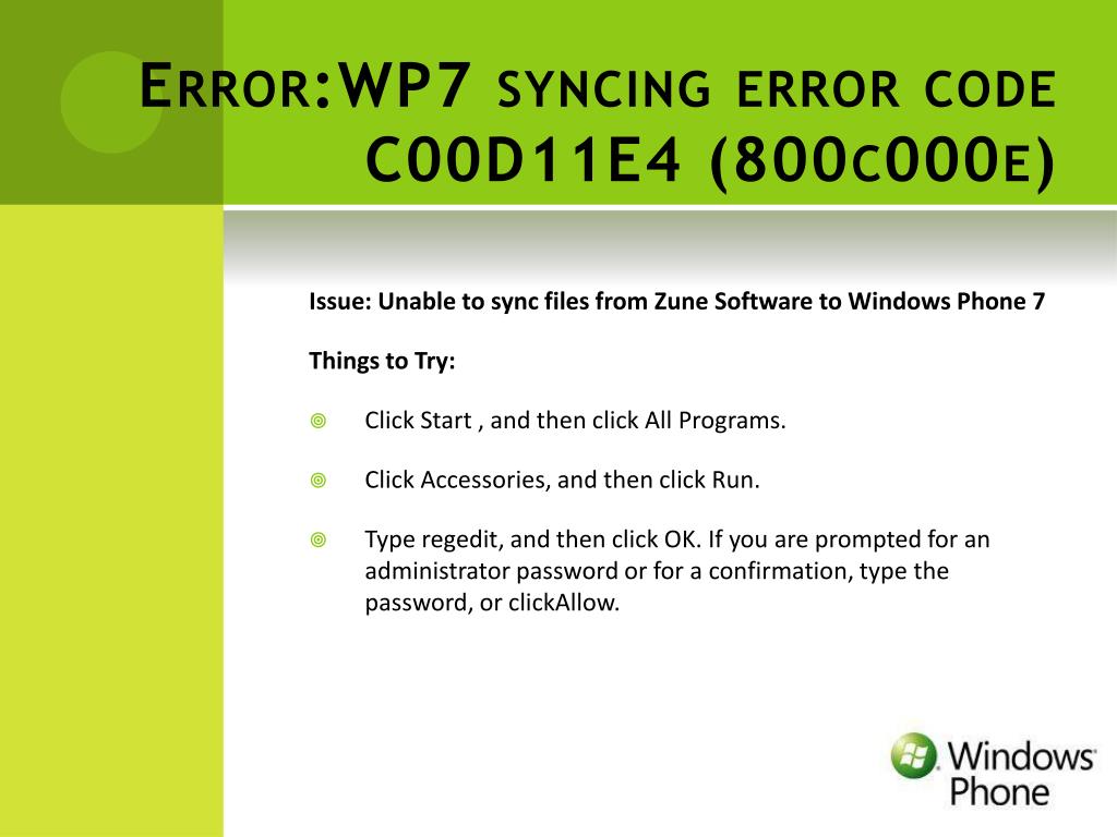 Error:WP7 syncing error code C00D11E4 (800c000e) Issue: Unable to sync files from Zune Software to Windows Phone 7 Things to Try: • Click Start , and then click All Programs. • Click Accessories, and then click Run. • Type regedit, and then click OK. If you are prompted for an administrator password or for a confirmation, type the password, or clickAllow.