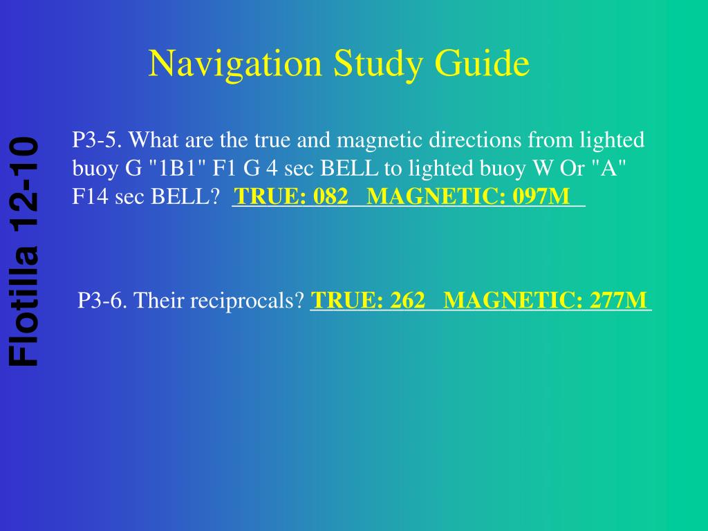Navigation Study Guide P3-5. What are the true and magnetic directions from lighted buoy G "1B1" F1 G 4 sec BELL to lighted buoy W Or "A" F14 sec BELL? ______________________________ TRUE: 082 MAGNETIC: 097M P3-6. Their reciprocals? _____________________________ TRUE: 262 MAGNETIC: 277M