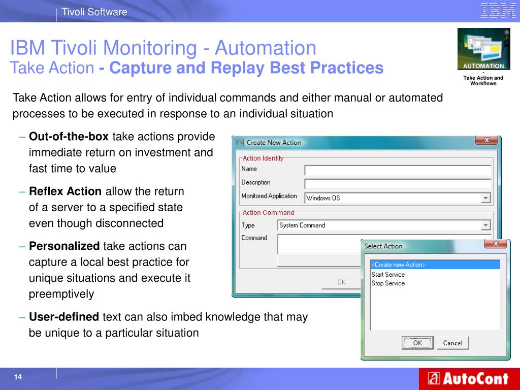 IBM Tivoli Monitoring - AutomationTake Action - Capture and Replay Best Practices Take Action allows for entry of individual commands and either manual or automated processes to be executed in response to an individual situation • Out-of-the-box take actions provide immediate return on investment andfast time to value • Reflex Action allow the returnof a server to a specified stateeven though disconnected • Personalized take actions cancapture a local best practice forunique situations and execute itpreemptively • User-defined text can also imbed knowledge that maybe unique to a particular situation