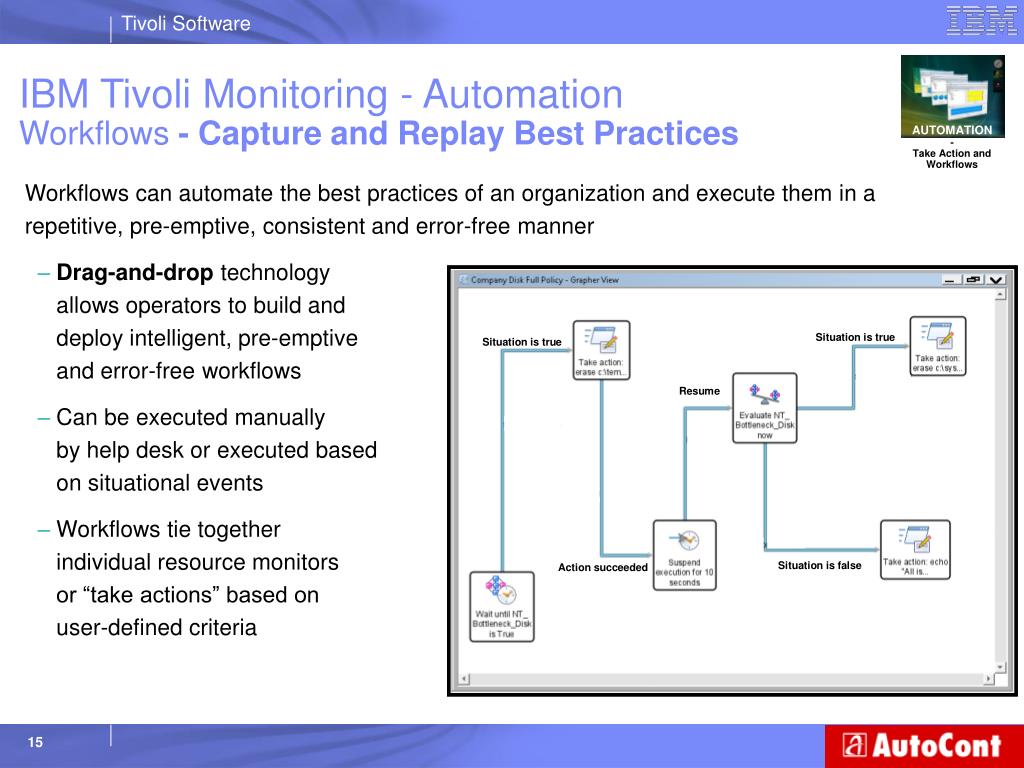 IBM Tivoli Monitoring - AutomationWorkflows - Capture and Replay Best Practices Workflows can automate the best practices of an organization and execute them in a repetitive, pre-emptive, consistent and error-free manner • Drag-and-drop technologyallows operators to build anddeploy intelligent, pre-emptiveand error-free workflows • Can be executed manuallyby help desk or executed basedon situational events • Workflows tie togetherindividual resource monitorsor “take actions” based onuser-defined criteria