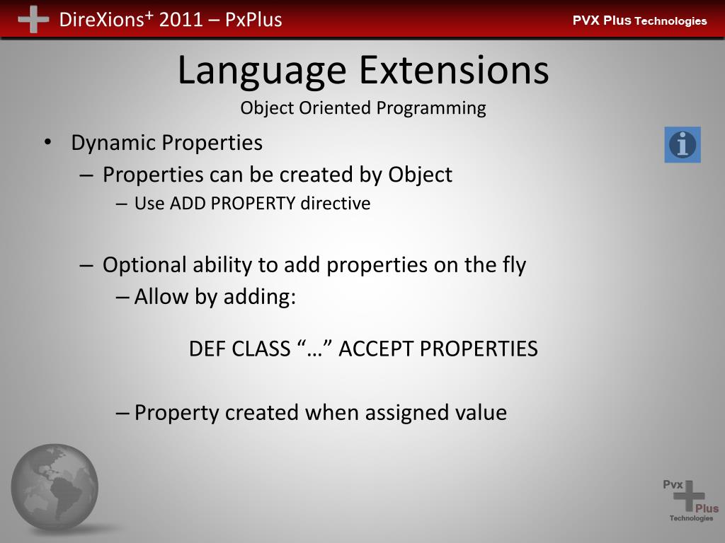 Language ExtensionsObject Oriented Programming Dynamic Properties Properties can be created by Object Use ADD PROPERTY directive Optional ability to add properties on the fly Allow by adding: DEF CLASS “…” ACCEPT PROPERTIES Property created when assigned value