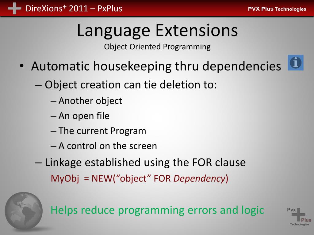 Language ExtensionsObject Oriented Programming • Automatic housekeeping thru dependencies • Object creation can tie deletion to: • Another object • An open file • The current Program • A control on the screen • Linkage established using the FOR clause MyObj = NEW(“object” FOR Dependency) Helps reduce programming errors and logic