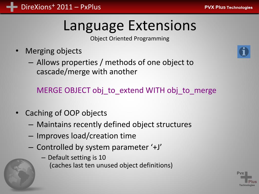 Language ExtensionsObject Oriented Programming Merging objects Allows properties / methods of one object to cascade/merge with anotherMERGE OBJECT obj_to_extend WITH obj_to_merge Caching of OOP objects Maintains recently defined object structures Improves load/creation time Controlled by system parameter ‘+J’ Default setting is 10 (caches last ten unused object definitions)