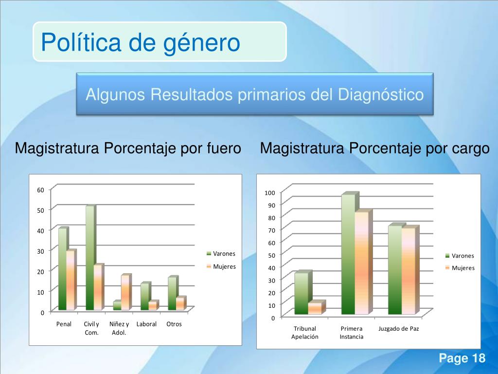 Política de género Algunos Resultados primarios del Diagnóstico Magistratura Porcentaje por fuero Magistratura Porcentaje por cargo