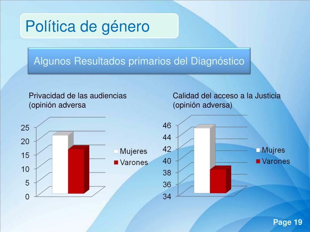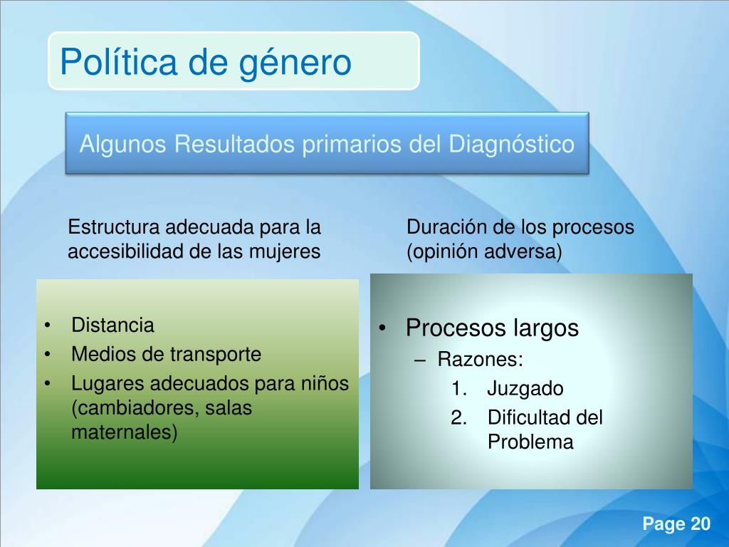 Política de género Algunos Resultados primarios del Diagnóstico • Distancia • Medios de transporte • Lugares adecuados para niños (cambiadores, salas maternales) • Procesos largos • Razones: • Juzgado • Dificultad del Problema Estructura adecuada para la accesibilidad de las mujeres Duración de los procesos (opinión adversa)
