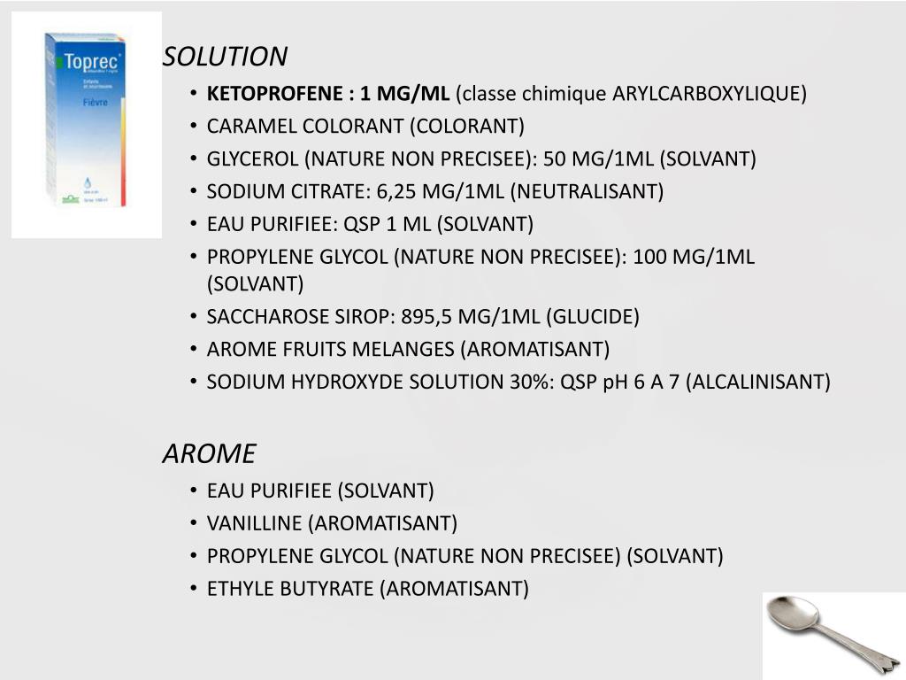 SOLUTION • KETOPROFENE : 1 MG/ML (classe chimique ARYLCARBOXYLIQUE) • CARAMEL COLORANT (COLORANT) • GLYCEROL (NATURE NON PRECISEE): 50 MG/1ML (SOLVANT) • SODIUM CITRATE: 6,25 MG/1ML (NEUTRALISANT) • EAU PURIFIEE: QSP 1 ML (SOLVANT) • PROPYLENE GLYCOL (NATURE NON PRECISEE): 100 MG/1ML (SOLVANT) • SACCHAROSE SIROP: 895,5 MG/1ML (GLUCIDE) • AROME FRUITS MELANGES (AROMATISANT) • SODIUM HYDROXYDE SOLUTION 30%: QSP pH 6 A 7 (ALCALINISANT) • AROME • EAU PURIFIEE (SOLVANT) • VANILLINE (AROMATISANT) • PROPYLENE GLYCOL (NATURE NON PRECISEE) (SOLVANT) • ETHYLE BUTYRATE (AROMATISANT)