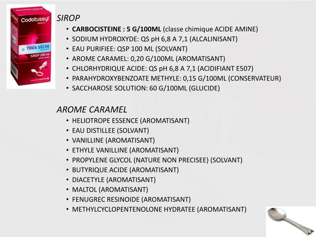 SIROP • CARBOCISTEINE : 5 G/100ML (classe chimique ACIDE AMINE) • SODIUM HYDROXYDE: QS pH 6,8 A 7,1 (ALCALINISANT) • EAU PURIFIEE: QSP 100 ML (SOLVANT) • AROME CARAMEL: 0,20 G/100ML (AROMATISANT) • CHLORHYDRIQUE ACIDE: QS pH 6,8 A 7,1 (ACIDIFIANT E507) • PARAHYDROXYBENZOATE METHYLE: 0,15 G/100ML (CONSERVATEUR) • SACCHAROSE SOLUTION: 60 G/100ML (GLUCIDE) • AROME CARAMEL • HELIOTROPE ESSENCE (AROMATISANT) • EAU DISTILLEE (SOLVANT) • VANILLINE (AROMATISANT) • ETHYLE VANILLINE (AROMATISANT) • PROPYLENE GLYCOL (NATURE NON PRECISEE) (SOLVANT) • BUTYRIQUE ACIDE (AROMATISANT) • DIACETYLE (AROMATISANT) • MALTOL (AROMATISANT) • FENUGREC RESINOIDE (AROMATISANT) • METHYLCYCLOPENTENOLONE HYDRATEE (AROMATISANT)