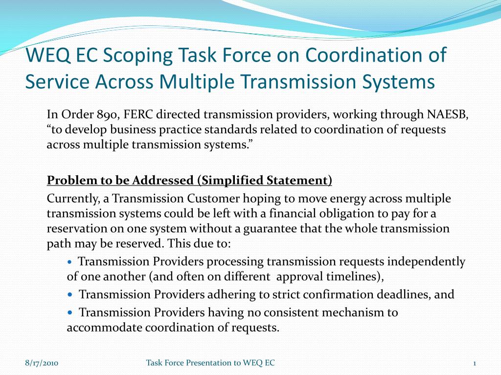 WEQ EC Scoping Task Force on Coordination of Service Across Multiple Transmission Systems. In Order 890, FERC directed transmission providers, working through NAESB, “to develop business practice standards related to coordination of requests across multiple transmission systems.”