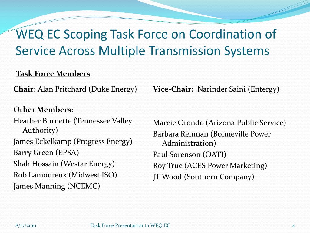 WEQ EC Scoping Task Force on Coordination of Service Across Multiple Transmission Systems Chair: Alan Pritchard (Duke Energy) Other Members: Heather Burnette (Tennessee Valley Authority) James Eckelkamp (Progress Energy) Barry Green (EPSA) Shah Hossain (Westar Energy) Rob Lamoureux (Midwest ISO) James Manning (NCEMC) Vice-Chair: Narinder Saini (Entergy) Marcie Otondo (Arizona Public Service) Barbara Rehman (Bonneville Power Administration) Paul Sorenson (OATI) Roy True (ACES Power Marketing) JT Wood (Southern Company) Task Force Members Task Force Presentation to WEQ EC