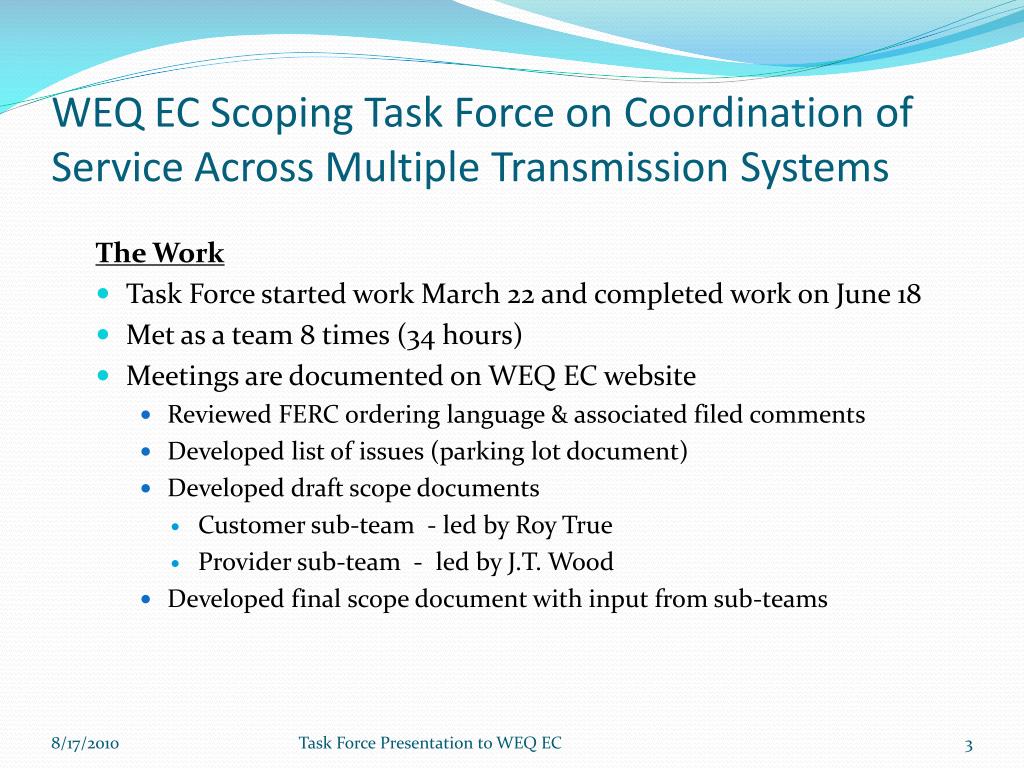 WEQ EC Scoping Task Force on Coordination of Service Across Multiple Transmission Systems The Work • Task Force started work March 22 and completed work on June 18 • Met as a team 8 times (34 hours) • Meetings are documented on WEQ EC website • Reviewed FERC ordering language & associated filed comments • Developed list of issues (parking lot document) • Developed draft scope documents • Customer sub-team - led by Roy True • Provider sub-team - led by J.T. Wood • Developed final scope document with input from sub-teams Task Force Presentation to WEQ EC
