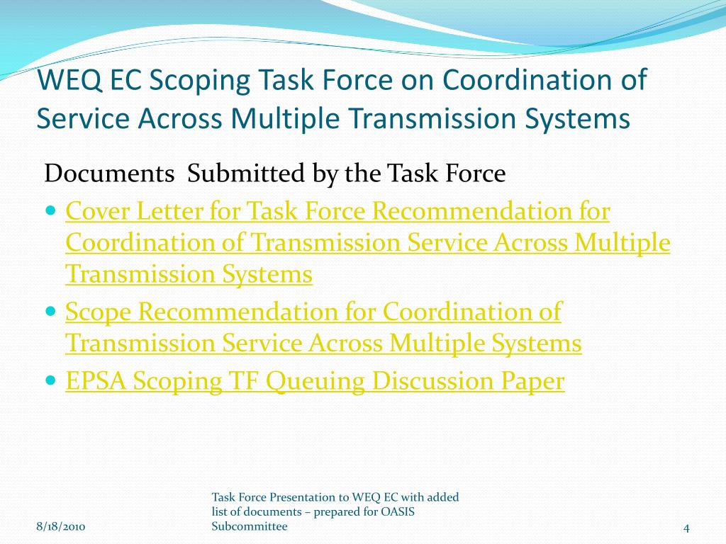 WEQ EC Scoping Task Force on Coordination of Service Across Multiple Transmission Systems Documents Submitted by the Task Force • Cover Letter for Task Force Recommendation for Coordination of Transmission Service Across Multiple Transmission Systems • Scope Recommendation for Coordination of Transmission Service Across Multiple Systems • EPSA Scoping TF Queuing Discussion Paper Task Force Presentation to WEQ EC with added list of documents – prepared for OASIS Subcommittee