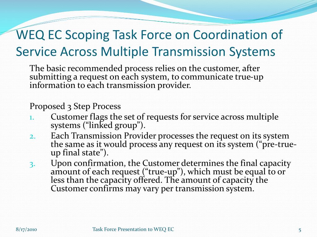 WEQ EC Scoping Task Force on Coordination of Service Across Multiple Transmission Systems The basic recommended process relies on the customer, after submitting a request on each system, to communicate true-up information to each transmission provider. Proposed 3 Step Process • Customer flags the set of requests for service across multiple systems (“linked group”). • Each Transmission Provider processes the request on its system the same as it would process any request on its system (“pre-true-up final state”). • Upon confirmation, the Customer determines the final capacity amount of each request (“true-up”), which must be equal to or less than the capacity offered. The amount of capacity the Customer confirms may vary per transmission system. Task Force Presentation to WEQ EC