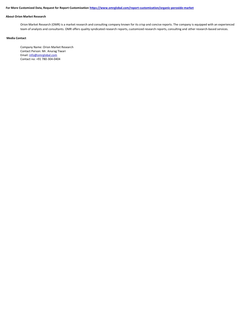 For More Customized Data, Request for Report Customization https://www.omrglobal.com/report-customization/organic-peroxide-market About Orion Market Research Orion Market Research (OMR) is a market research and consulting company known for its crisp and concise reports. The company is equipped with an experienced team of analysts and consultants. OMR offers quality syndicated research reports, customized research reports, consulting and other research-based services. Media Contact Company Name: Orion Market Research Contact Person: Mr. Anurag Tiwari Email: info@omrglobal.com Contact no: +91 780-304-0404