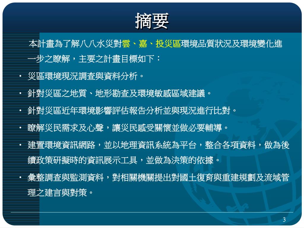 摘要 本計畫為了解八八水災對雲、嘉、投災區環境品質狀況及環境變化進一步之瞭解,主要之計畫目標如下: • 災區環境現況調查與資料分析。 • 針對災區之地質、地形勘查及環境敏感區域建議。 • 針對災區近年環境影響評估報告分析並與現況進行比對。 • 瞭解災民需求及心聲,讓災民感受關懷並做必要輔導。 • 建置環境資訊網路,並以地理資訊系統為平台,整合各項資料,做為後續政策研擬時的資訊展示工具,並做為決策的依據。 • 彙整調查與監測資料,對相關機關提出對國土復育與重建規劃及流域管理之建言與對策。