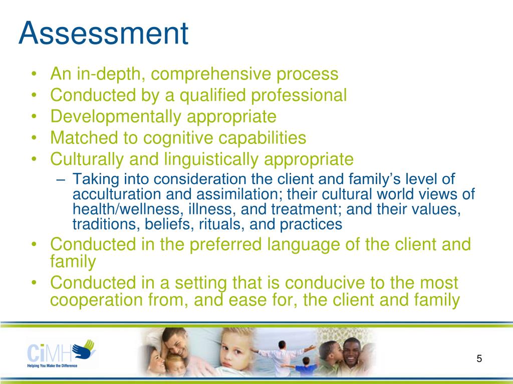 Assessment • An in-depth, comprehensive process • Conducted by a qualified professional • Developmentally appropriate • Matched to cognitive capabilities • Culturally and linguistically appropriate • Taking into consideration the client and family’s level of acculturation and assimilation; their cultural world views of health/wellness, illness, and treatment; and their values, traditions, beliefs, rituals, and practices • Conducted in the preferred language of the client and family • Conducted in a setting that is conducive to the most cooperation from, and ease for, the client and family