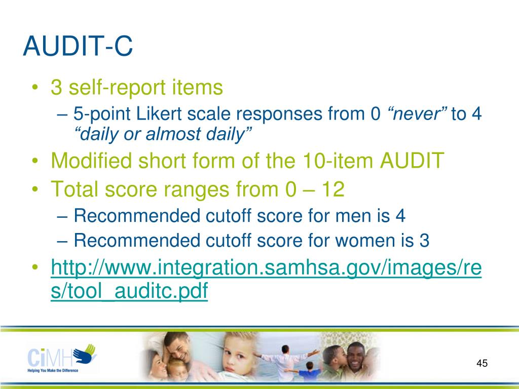 AUDIT-C • 3 self-report items • 5-point Likert scale responses from 0 “never” to 4 “daily or almost daily” • Modified short form of the 10-item AUDIT • Total score ranges from 0 – 12 • Recommended cutoff score for men is 4 • Recommended cutoff score for women is 3 • http://www.integration.samhsa.gov/images/res/tool_auditc.pdf