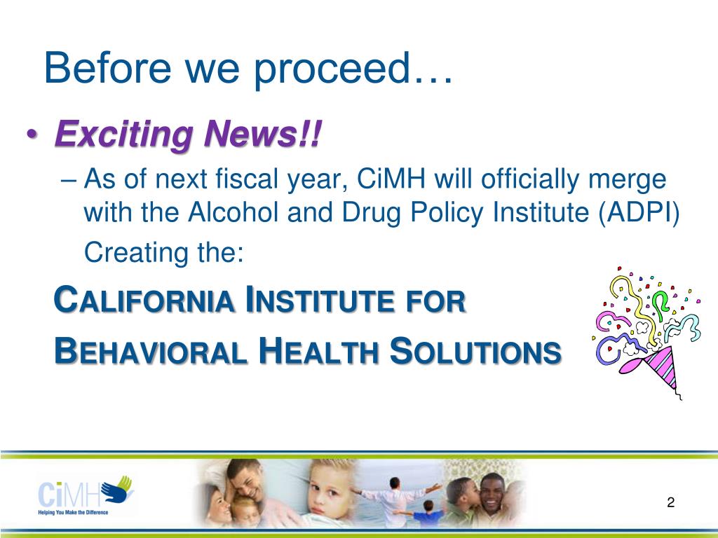 Before we proceed… • Exciting News!! • As of next fiscal year, CiMH will officially merge with the Alcohol and Drug Policy Institute (ADPI) Creating the: California Institute for Behavioral Health Solutions
