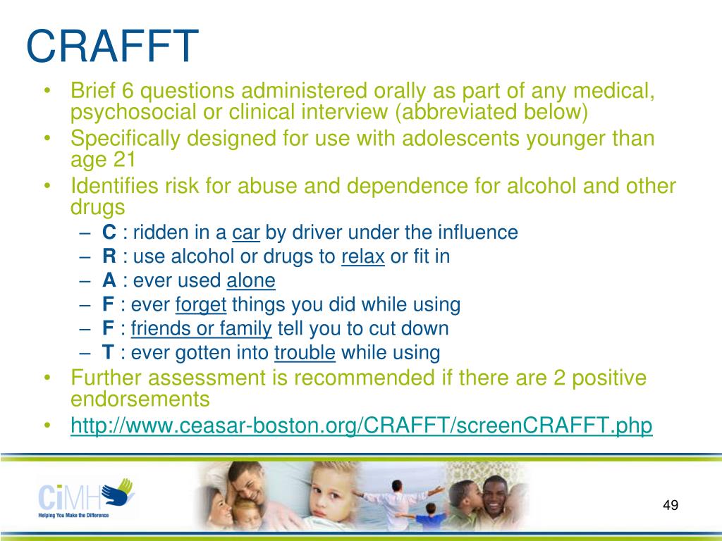 CRAFFT • Brief 6 questions administered orally as part of any medical, psychosocial or clinical interview (abbreviated below) • Specifically designed for use with adolescents younger than age 21 • Identifies risk for abuse and dependence for alcohol and other drugs • C : ridden in a car by driver under the influence • R : use alcohol or drugs to relax or fit in • A : ever used alone • F : ever forget things you did while using • F : friends or family tell you to cut down • T : ever gotten into trouble while using • Further assessment is recommended if there are 2 positive endorsements • http://www.ceasar-boston.org/CRAFFT/screenCRAFFT.php