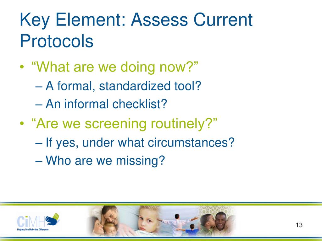 Key Element: Assess Current Protocols • “What are we doing now?” • A formal, standardized tool? • An informal checklist? • “Are we screening routinely?” • If yes, under what circumstances? • Who are we missing?