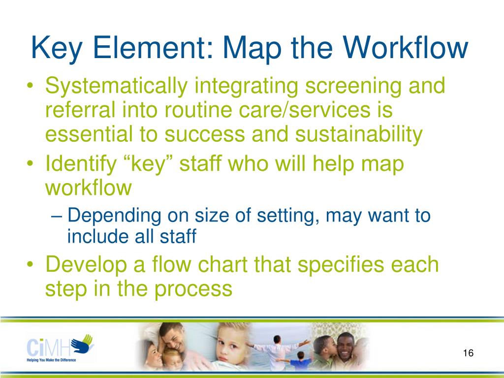 Key Element: Map the Workflow • Systematically integrating screening and referral into routine care/services is essential to success and sustainability • Identify “key” staff who will help map workflow • Depending on size of setting, may want to include all staff • Develop a flow chart that specifies each step in the process